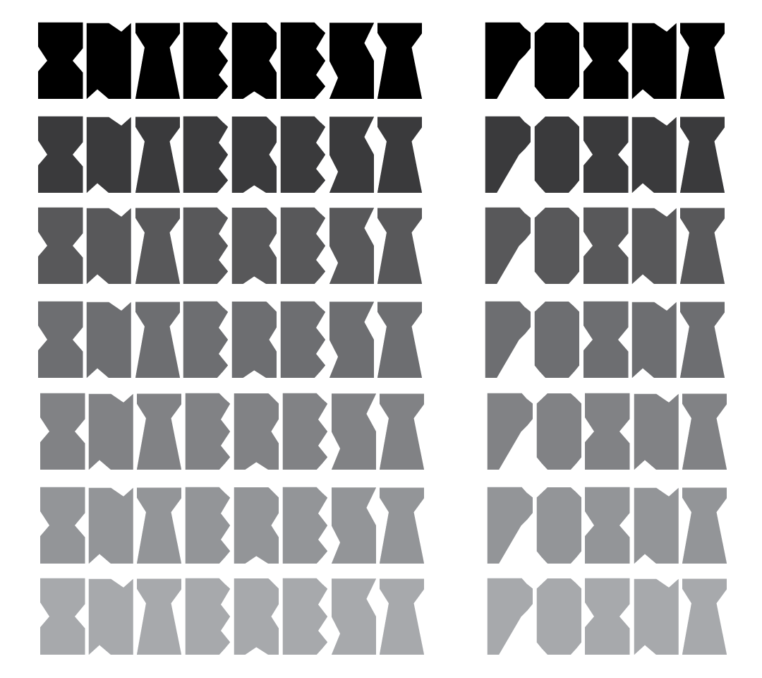 Interest Point is a font born from 20 dynamic anchor points that shift and twist on a vertical rectangle, each movement sculpting a letter, symbol, or punctuation mark with fluid precision. This striking design draws its inspiration from the Edwards Passmore Library and Bathhouse, with an irregular, almost rebellious floor plan which echoes in every curve of the font. The building itself is a fractured rectangle, its walls slanted and corners sharp, each turn a deliberate defiance of symmetry'much like the font that mirrors its architectural complexity. Yet, despite its jagged origin, each glyph in Interest Point is perfectly uniform, occupying the same precise width, creating a surprisingly geometric harmony. This contrast is where the true beauty lies, as the font's crisp, ordered structure stands in sharp juxtaposition to the building's timeworn elegance. The library, with its intricately carved stone and delicate details, speaks to a history long past, its weathered surfaces echoing the passage of time'just as Interest Point bridges the gap between the old and the new in its bold, geometric form.