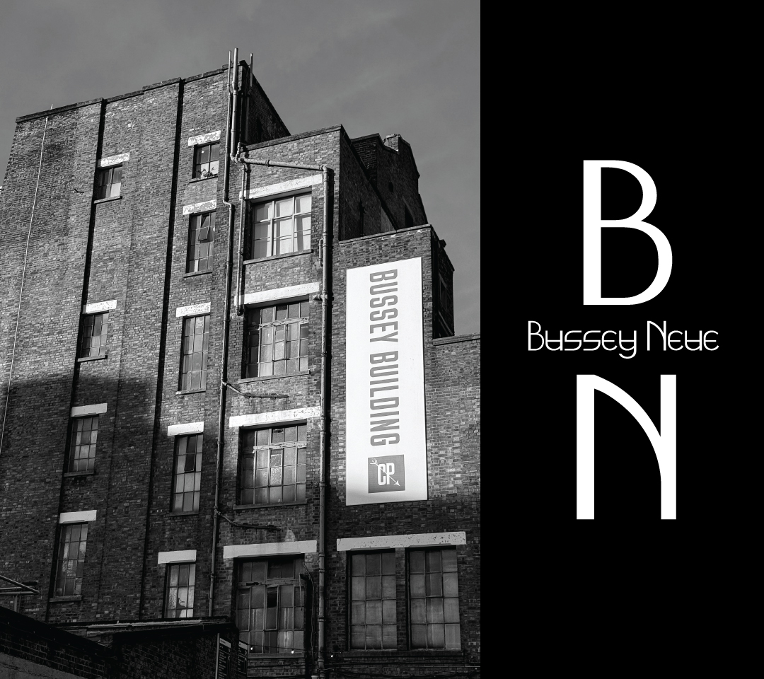 Bussey Neue is a sans serif typeface inspired by the Bussey Building in Copeland Park, Peckham. Rooted in the disciplined geometry of Victorian industrial architecture, it translates the site's construction logic into letterforms. The base unit is a window, used as a simple frame into Victorian construction, while deliberately avoiding the era's ornamental typographic flourish. Each glyph is built from a small set of repeatable modules, reflecting the efficiency of factory making and the building's modular fabric. The forms draw on robust load bearing structures, the soft curvature of arched windows, and reinforcing details suggested by grid based fenestration.