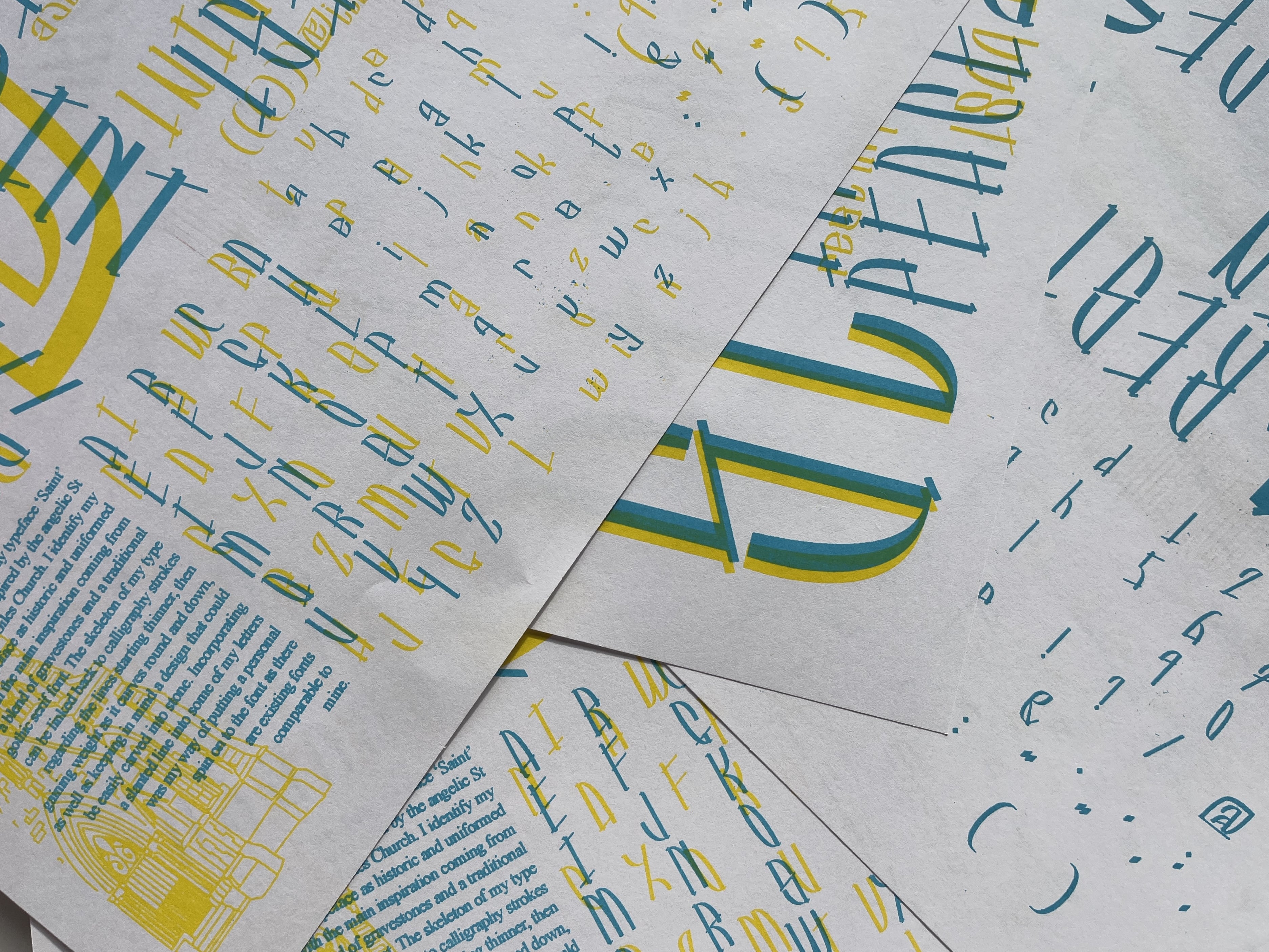 My display typeface 'Saint' is inspired by the angelic St Giles Church. I identify my typeface as historic and uniformed with the main inspiration coming from a blend of gravestones and a traditional gothic serif font. The skeleton of my type can be linked back to calligraphy strokes regarding the lines starting thinner, then gaining weight as it curves round and down, as well as keeping in mind a design that could be easily carved into stone. Incorporating a slanted line into some of my letters was my way of putting a personal spin on to the font as there are existing fonts comparable to mine.