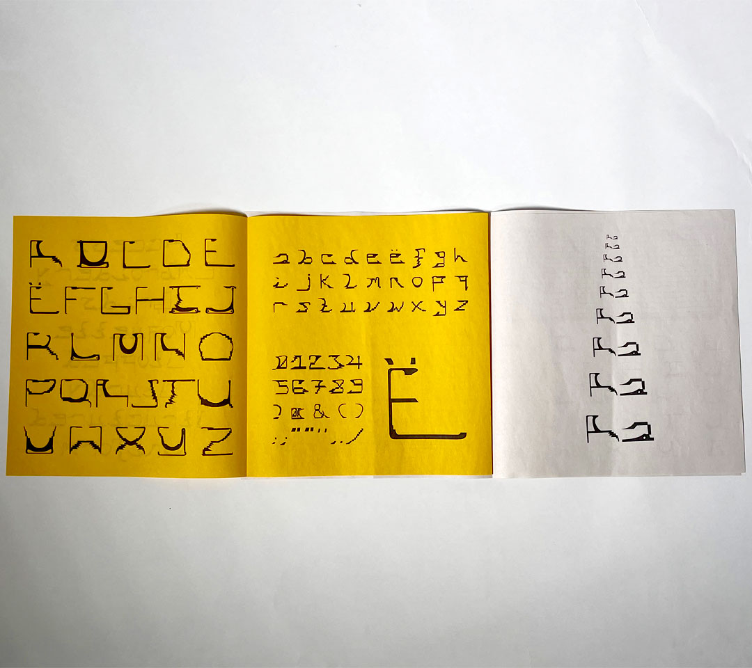 My display typeface 'Stopped' is inspired by Camberwell Bus Garage. It draws inspiration from the sturdy metal structures (in and around the garage), the embroidery on bus seats and my first visit there where I experienced the lack of access to the site. I was drawn to the seat pattern of the 68 bus, so I found its moquette. I then traced it and used it as a grid to make a matrix typeface. To make the typeface as cohesive as possible, I repeated curves and thicknesses in certain parts of letters and made the letters mono spaced.