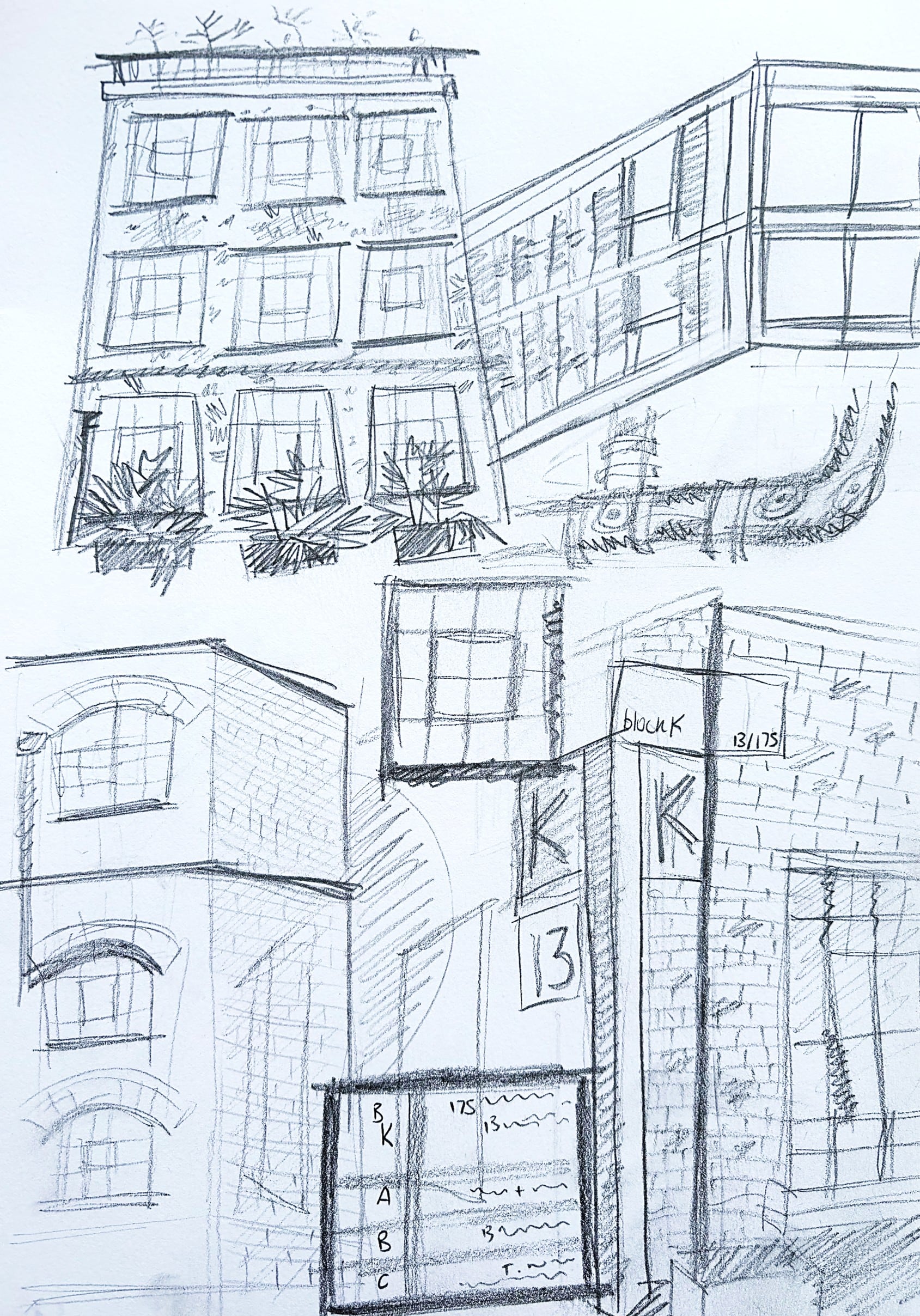 Looking closely at the formal elements of my site, Tikari Works, I settled on the windows which I noticed have interesting frameworks throughout. I made the decision to introduce these elements as grids within the skeleton for each letterform. These could be deconstructed and then built up again as I worked with them. The result is a structural, sculptural-looking typeface featuring lines and blocky shapes. The font itself also has added perspective such that you are always looking up at it to emphasize the characteristic of looking through a window.